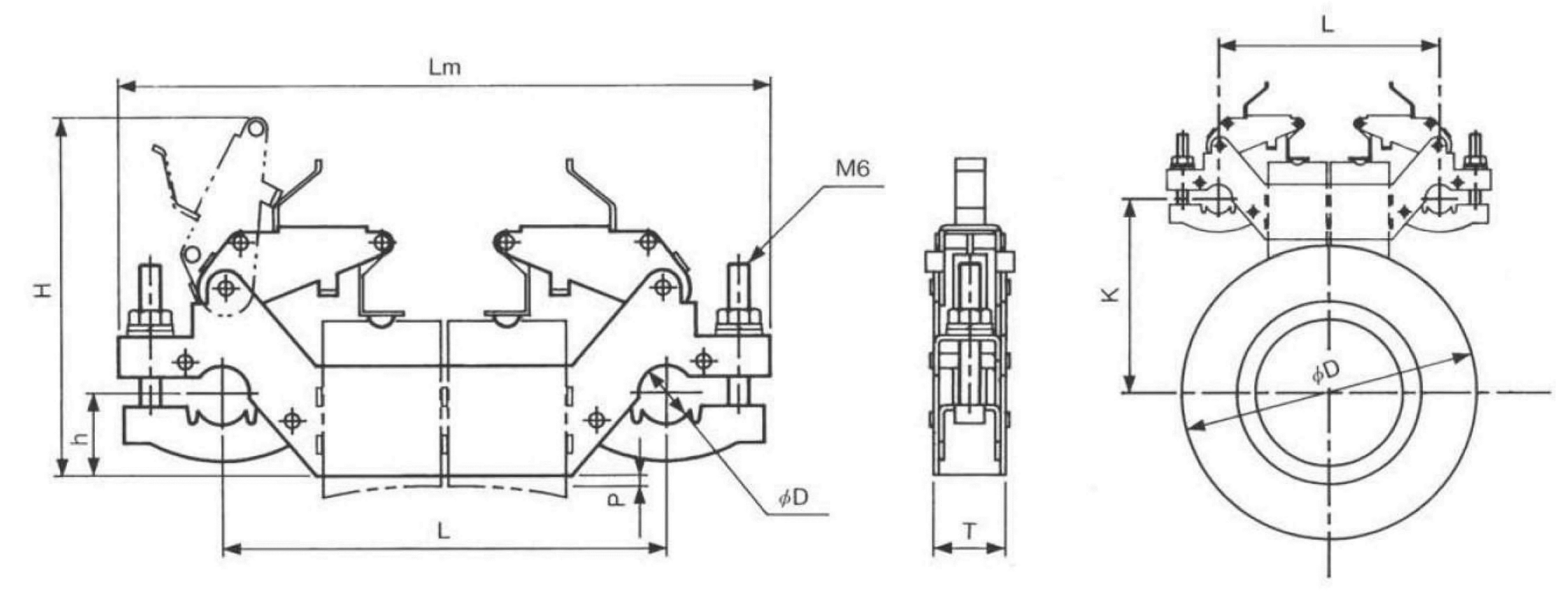 ブラシホルダー Bシリーズ 2025 5/04 ・1極にブラシを2個使用できる大電流対応の製品です。・1つのブラシホルダーで最大240Aまで対応できます。 外径寸法 カタログ スリップリング部品 ブラシホルダー/ブラシ